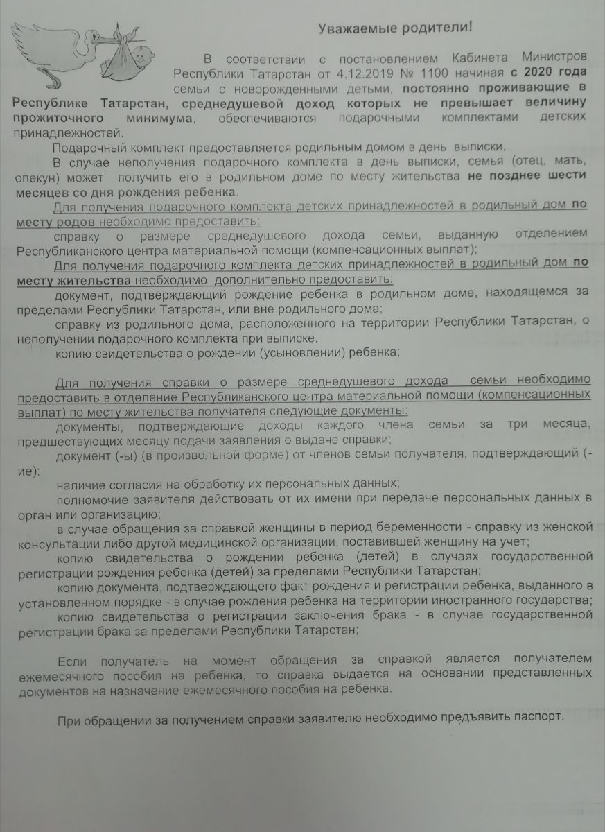 Уважаемые родители! По данной ссылке вы можете ознакомиться с информацией о предоставлении подарков для семей с новорожденными детьми, постоянно проживающие в Республике Татарстан , среднедушевой доход которых не превышает величину прожиточного минимума. Информация так же размещена в каждой группе и на доске объявлений в детском саду.