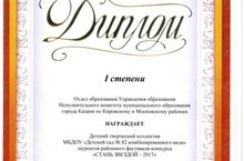 Детский творческий коллектив детского сада выступил на ежегодном районном фестивале "Стань звездой -2017" и был удостоен Диплома лауреата 1 степени Отдела образования Кировского и Московского районов г.Казани.