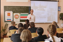 Сегодня состоялся парламентский урок в 5-х классах по теме "Государственная символика РТ и РФ". На уроке присутствовали гости депутат Госсовета РТ Григорьев А.П. и корреспондент программы "Город" Дмитрий Аверкиев они ответили на вопросы школьников и провели викторину на знание символики Рт и РФ. В конце встречи все вместе спели гимн Татарстана.