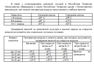 В связи с установившейся морозной погодой в Республике Татарстан Министерство образования и науки Республики Татарстан (далее - Министерство) рекомендует при низкой температуре воздуха приостановить учебные занятия: