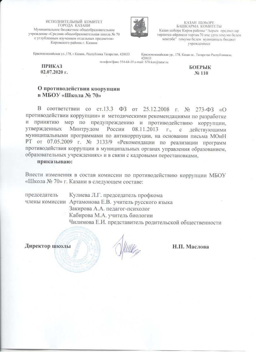 План мероприятий МБОУ "Школа 70" по противодействию коррупции