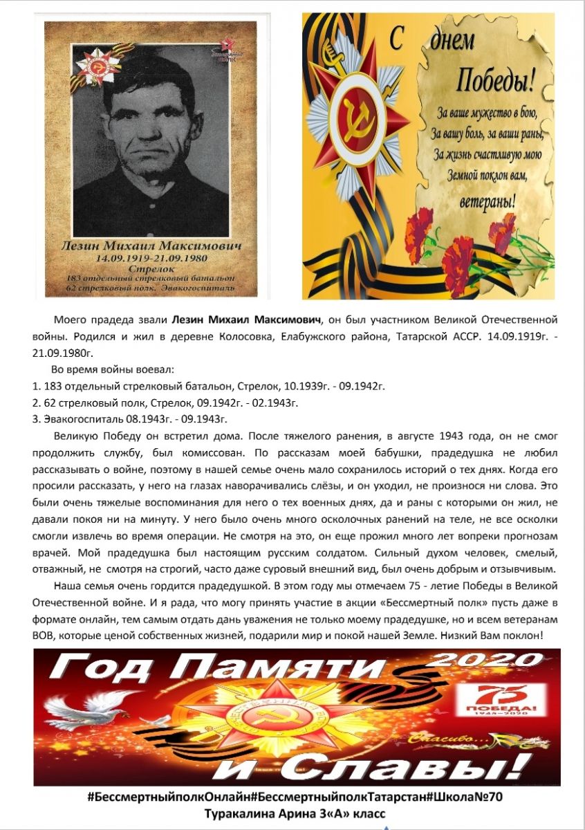 Рассказ ученицы 3 класса Туракалиной Арины о своем прадедушке