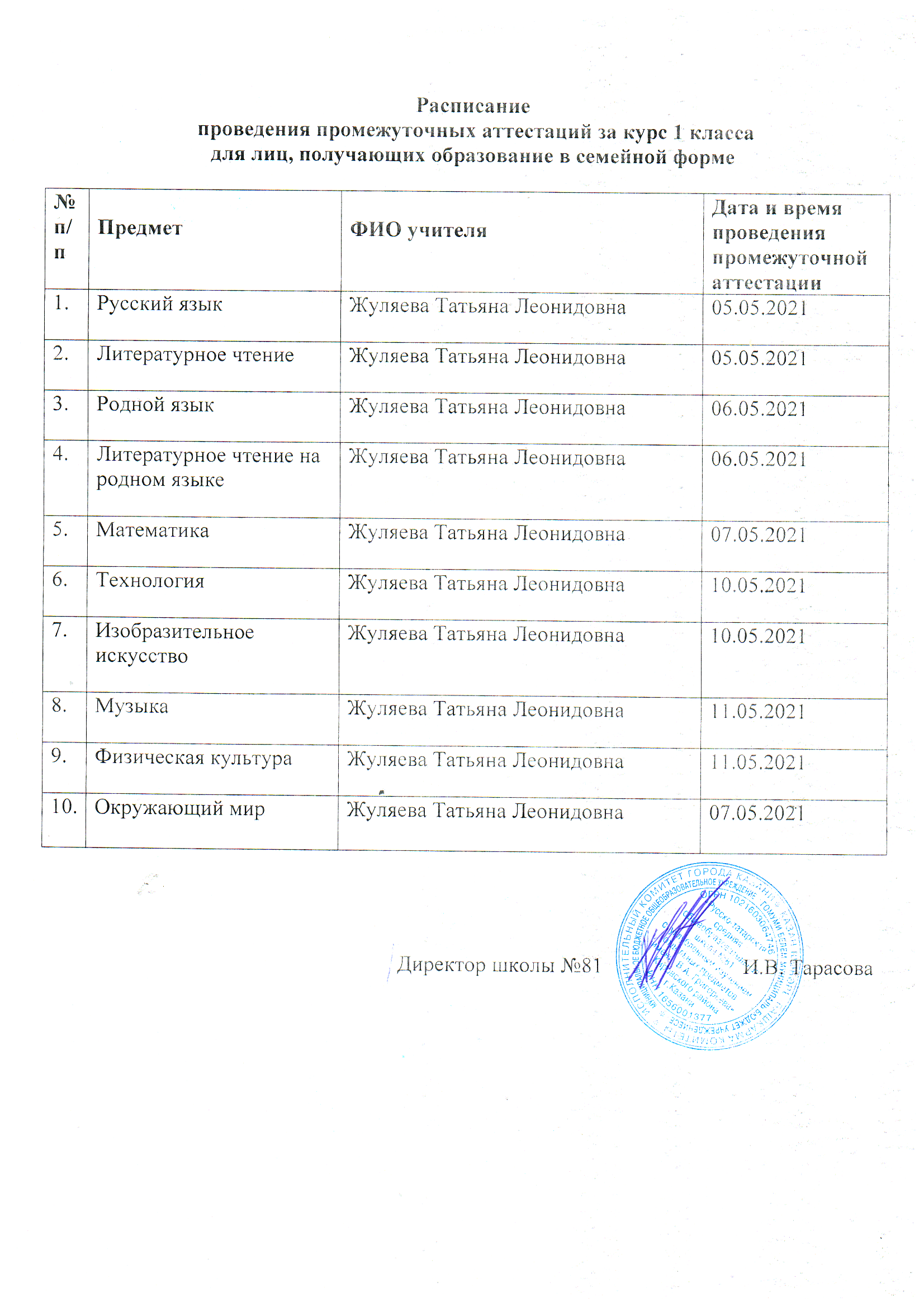 Расписание проведения промежуточных аттестаций за курс 1 класса для лиц, получающих образование в семейной форме