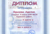 В рамках Месячника безопасности дорожного движения в Кировском районе г.Казани прошел конкурс поделок среди начального звена «Мы и дорога». Мы с радостью поздравляем Яфизову Аделию с достойным 3 местом в этом конкурсе! Желаем ей дальнейших творческих побед!