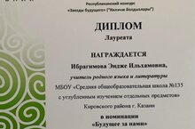Поздравляем учителя родного языка и литературы Ибрагимову Эндже Ильхамовну, которая приняла участие в Республиканском конкурсе "Звезды будущего" и стала лауреатом конкурса!