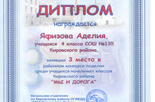 В рамках Месячника безопасности дорожного движения в Кировском районе г.Казани прошел конкурс поделок среди учеников 1-4 классов «Мы и дорога». Мы с радостью поздравляем Яфизову Аделию с достойным 3 местом в этом конкурсе! Желаем ей дальнейших творческих побед!