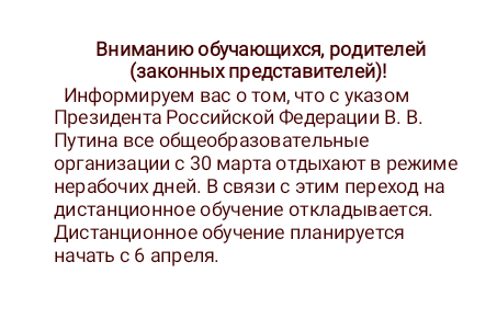 Просим ВАС с пониманием отнестись к переходу на дистанционное обучение, это делается ради ВАС и ВАШИХ детей.