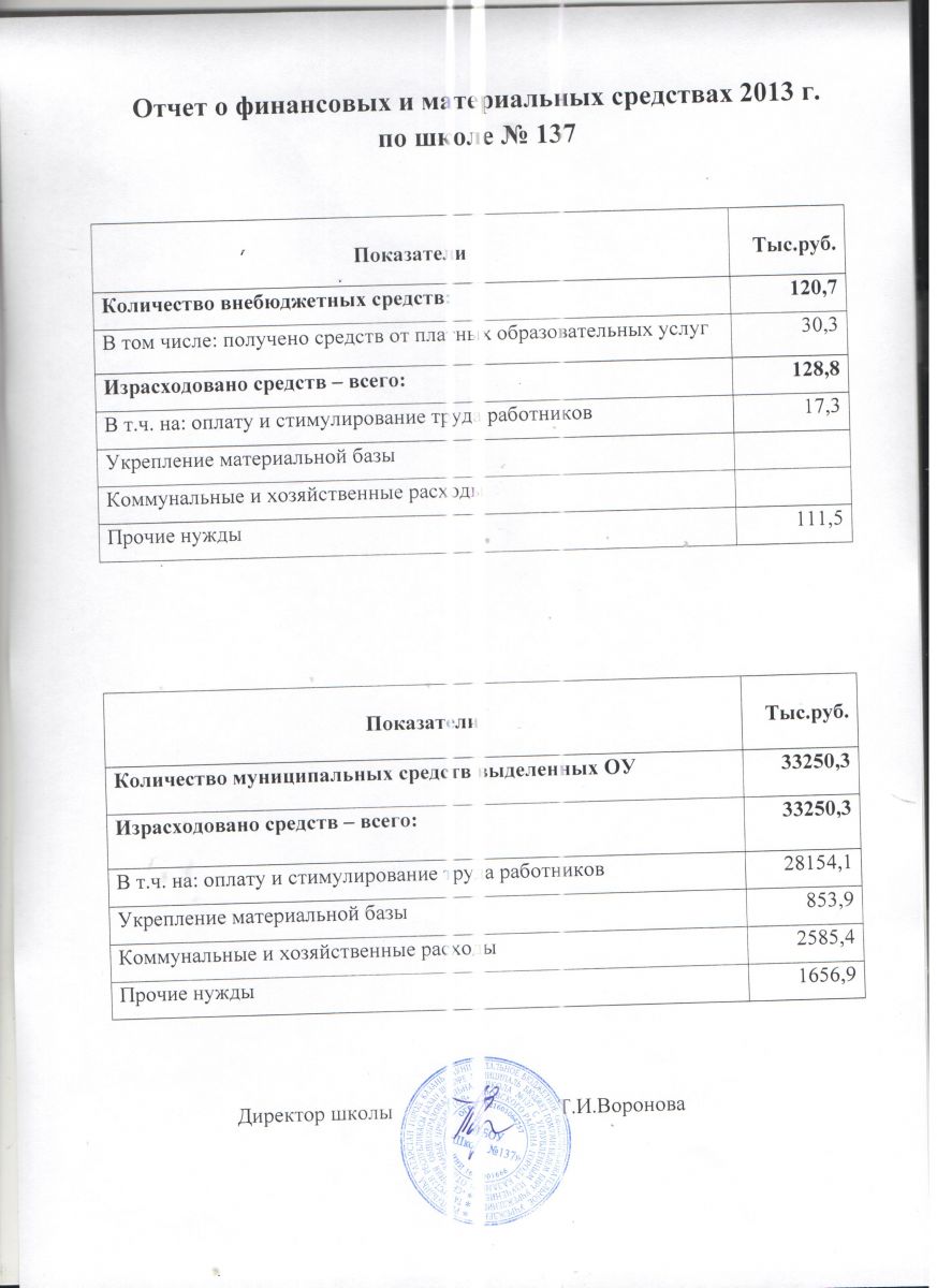Отчет о финансовых и материальных средствах за 2013 г. по школе № 137