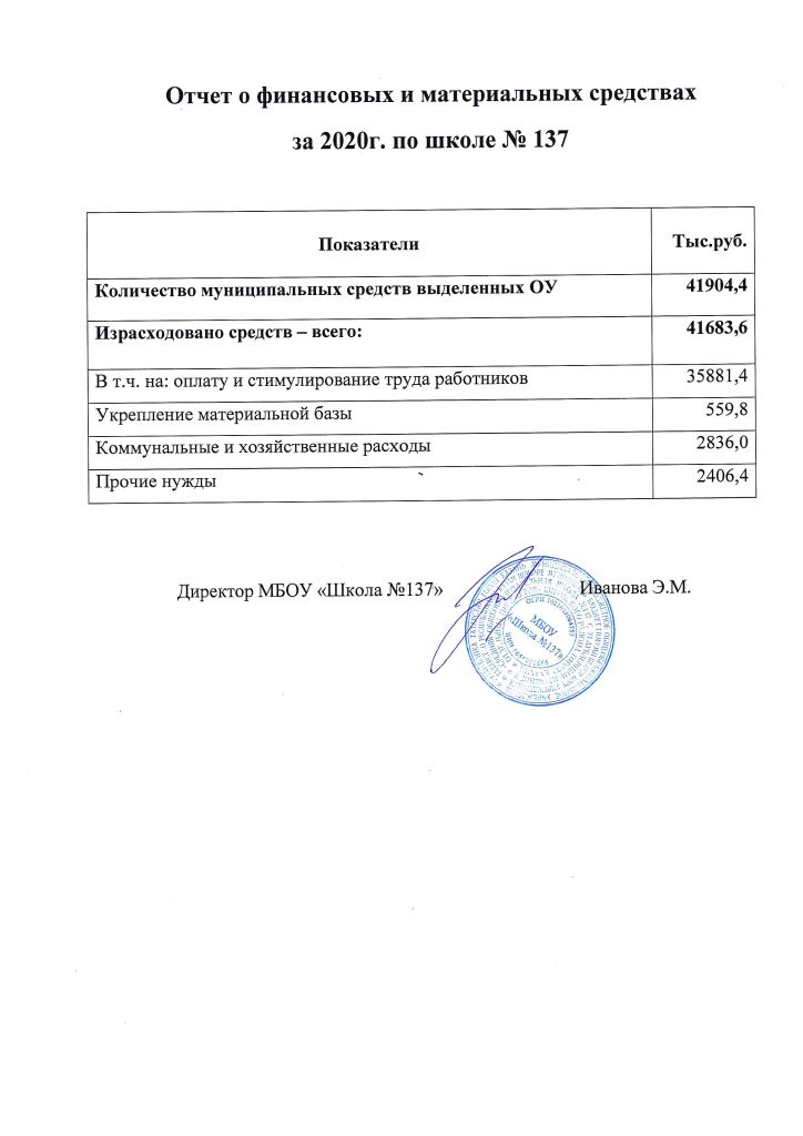 Отчет о финансовых и материальных средствах за 2020 г. по школе №137