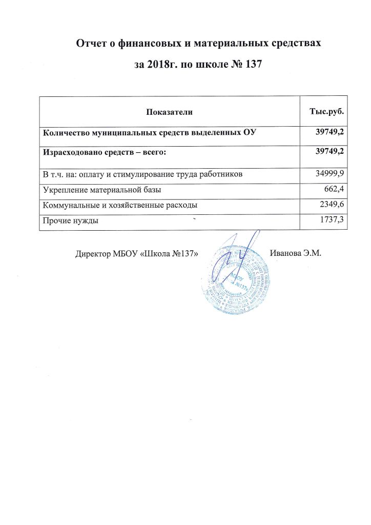 Отчет о финансовых и материальных средствах за 2018 г. по школе №137