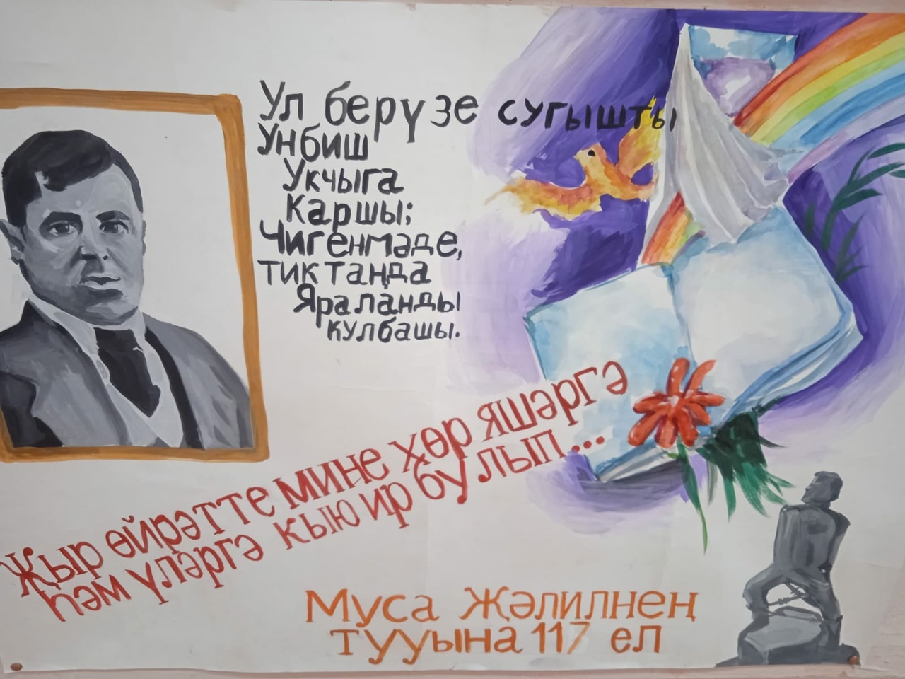 Һәр елны 15 февраль көнне патриот шагыйрь Муса Җәлилнең туган көнен гимназиядә билгеләп үтәбез.Быел да Муса Җәлилнең тууына 117 ел тулуга багышланган бик матур чаралар узды.Укучылар тагын бер кат шагыйрьнең тормышы, иҗаты белән якыннан таныштылар , яттан шигырьләрен башкардылар