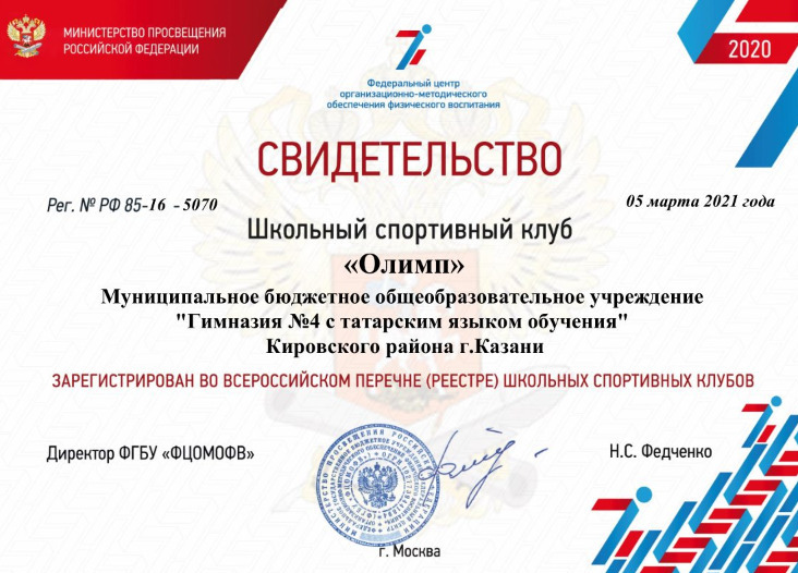 Свидетельство о регистрации во всероссийском перечне (реестре) школьных спортивных клубов № РФ 85-16-5070 от 05.03.2021 СКАЧАТЬ