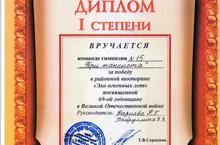 Диплом I степени вручили команде гимназии "Три танкиста" (рук. Бариева Р.Г., Хайруллина З.З.) за победу в районной викторине посвященной 69-ой годовщине в Великой Отечественной войне.