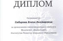 Дипломом наградили Сабирову Елену Викторовну за организацию сверхпрограммного конкурса Мультитест, лбъявленного Институтом Развития Школьного Образования.