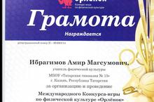 Грамотой наградили Ибрагимова Амира Магсумовича за организацию и проведение Международного Конкурса-игры по физической культуре "Орленок"