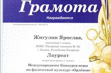 Грамотой наградили лауреата Международного Конкурса-игры по физической культуре "Орленок" Жигулина Ярослава.