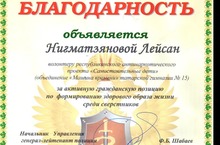Благодарность объявляется Нигматзяновой Лейсан за активную гражданскую позицию по формированию здорового образа жизни среди сверстников.