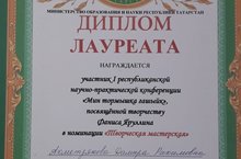 Поздравляем ученицу 9б класса Даутову Диляру с победой на республиканской конференции, посвященной творчеству Ф.Яруллина. Педагог Ахметзянова Д.Р.