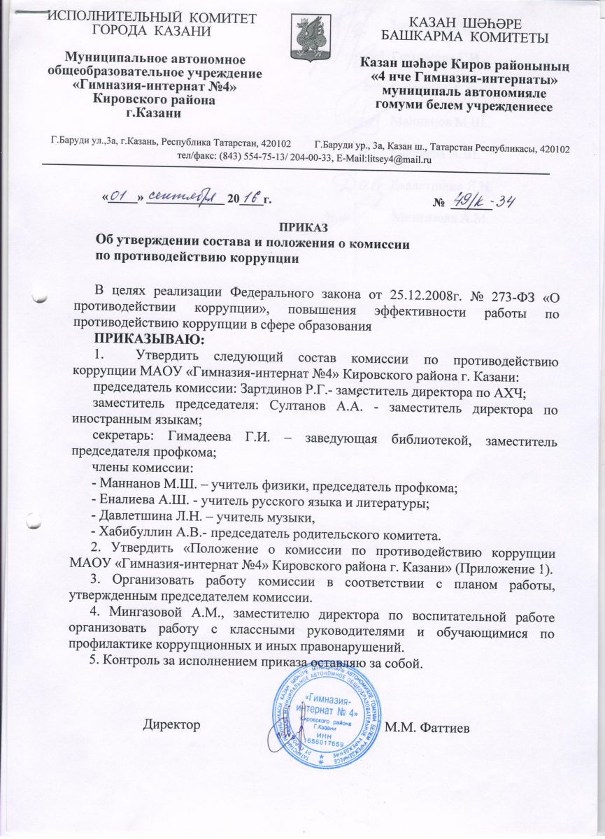 Приказ об утверждении и положения о комиссии по противодействию коррупции.