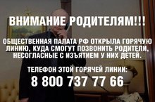 В Общественной палате РФ открылась "горячая линия" по вопросам необоснованных изъятий детей из семьи.Обращения будут обрабатывать группы экспертов.Телефон горячей линии: 8-800-737-77-66.Звонок из любого региона России бесплатный.Время работы: пн-чт с 9 до 18, пт с 9 до 16:45 по МСК. -