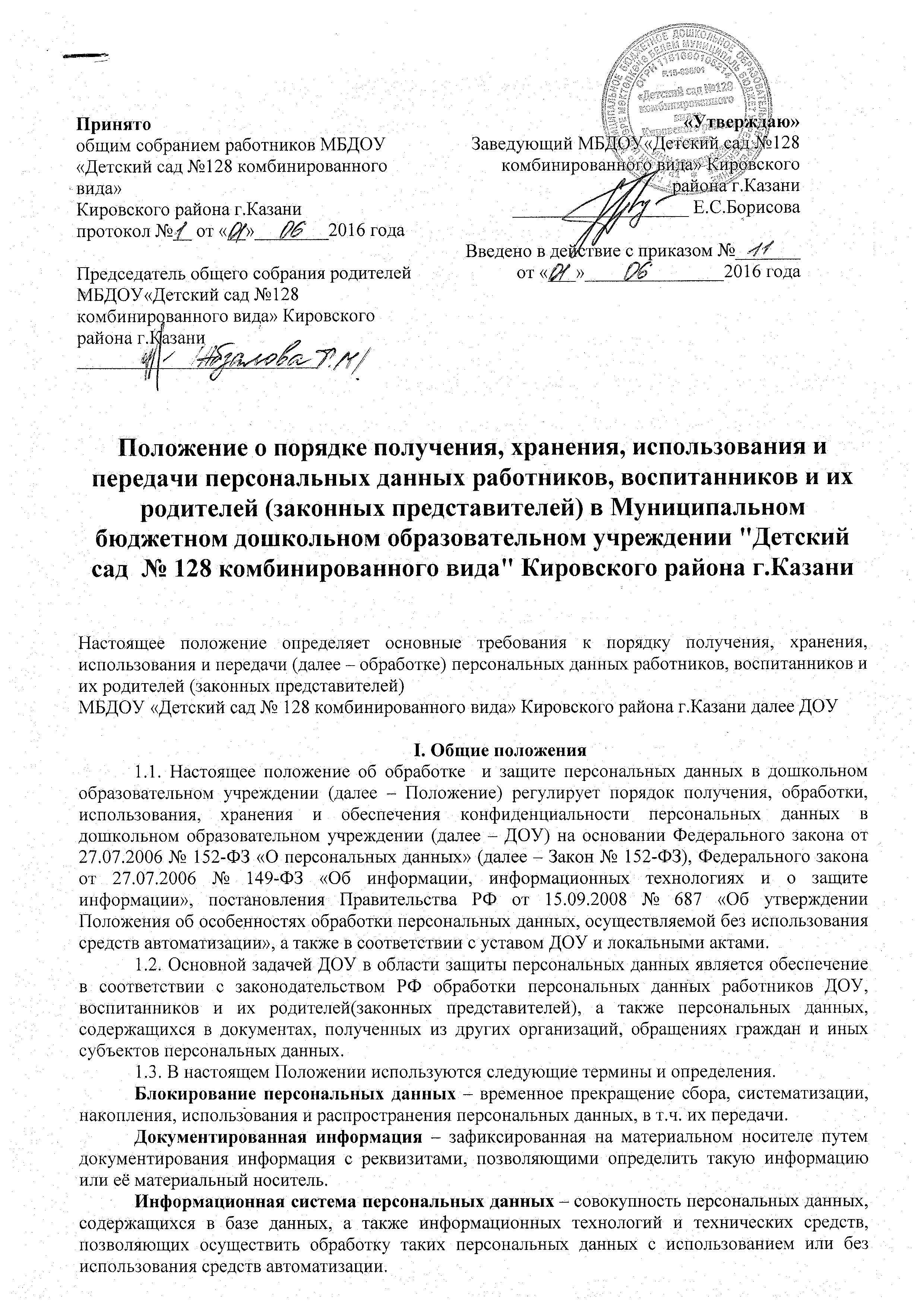 Положение о порядке получения, хранения, использования и передачи персональных данных работников, воспитанников, их родителей (законных представителей)