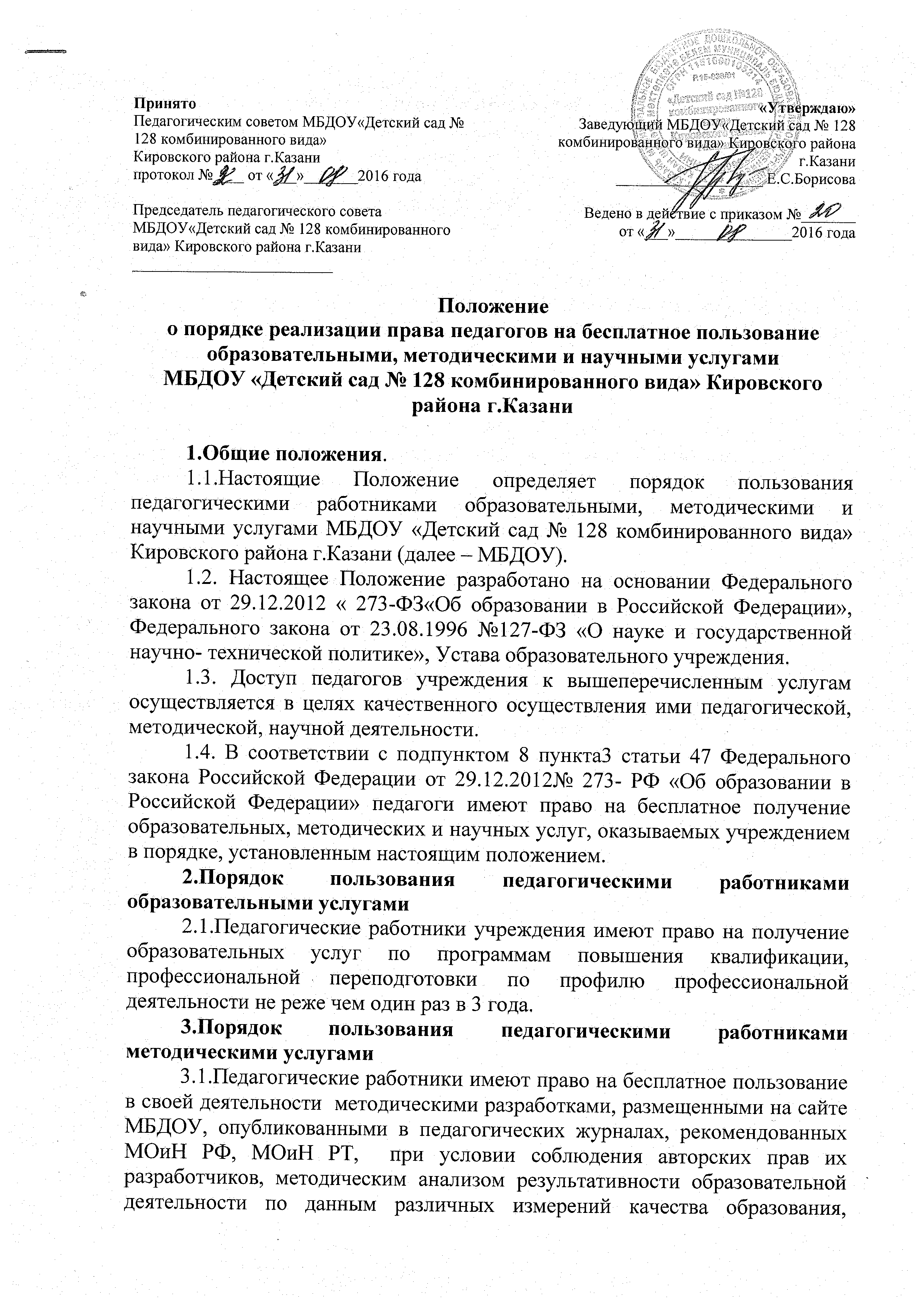 Положение о порядке реализации права педагогов на бесплатное пользование образовательными, методическими и научными услугами