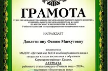 Наш педагог Давлетшина Фания Масхутовна стала лауреатом районного этапа конкурса "Воспитатель года". Желаем дальнейших творческих побед!