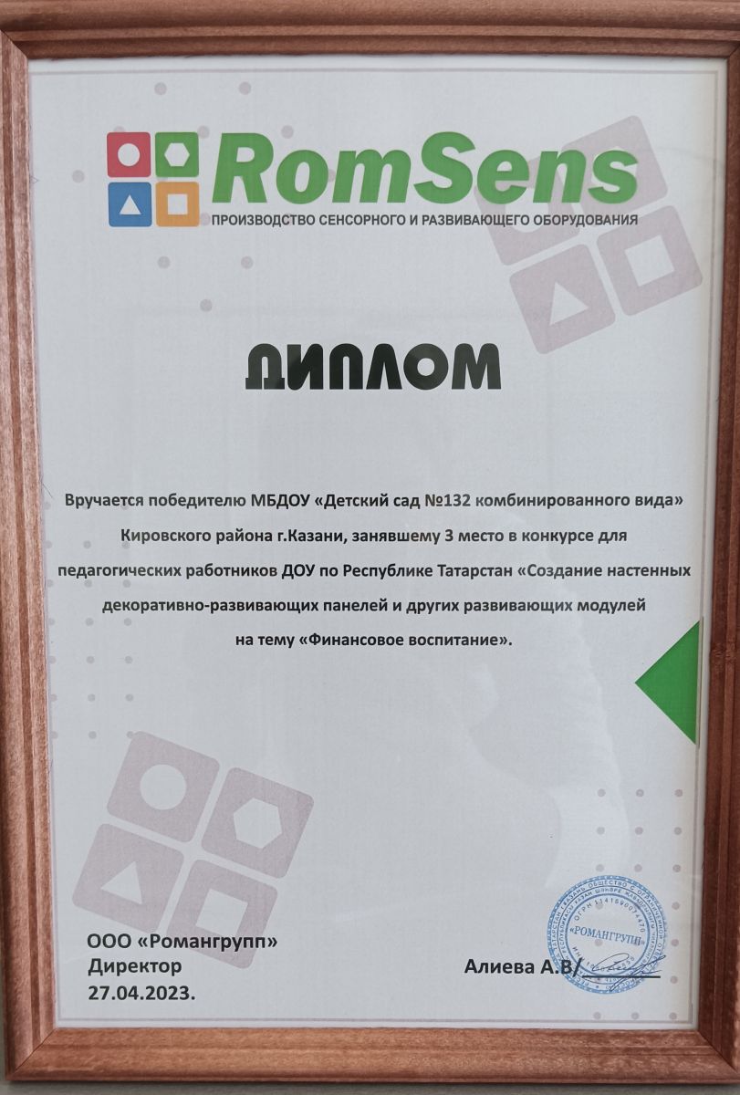 Команда наших талантливых педагогов приняла участие в для педагогических работников ДОУ по Республике Татарстан "Создание настенных декоративно-развивающих панелей и других развивающих модулей на тему "Финансовая грамотность" и заняли почетное третье место!!! И уже в новом учебном году наши любимые воспитанники смогут обогащать и закреплять свои знания в области финансовой грамотности при помощи такой панели, которую нам изготовит организатов конкурса компания RomSens по нашему эскизу.