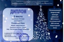 Романчев Иван, учащийся объединения "Светлячок"( руководитель Костюхина Л.Л.) стал призером регионального творческого конкурса "Зимние фантазии".Молодец!