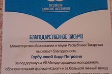 Министерство образования и науки Республики Татарстан выразил благодарность педагогу дополнительного образования МБУДО "ЦДОД "Заречье" - Горбуновой А.П. за поддержку на VII Международном молодёжном образовательном форуме "Селет" и за большой вклад в организации и проведении первого масштабного палаточного лагеря "Leaders Buler Forum". Поздравляем!
