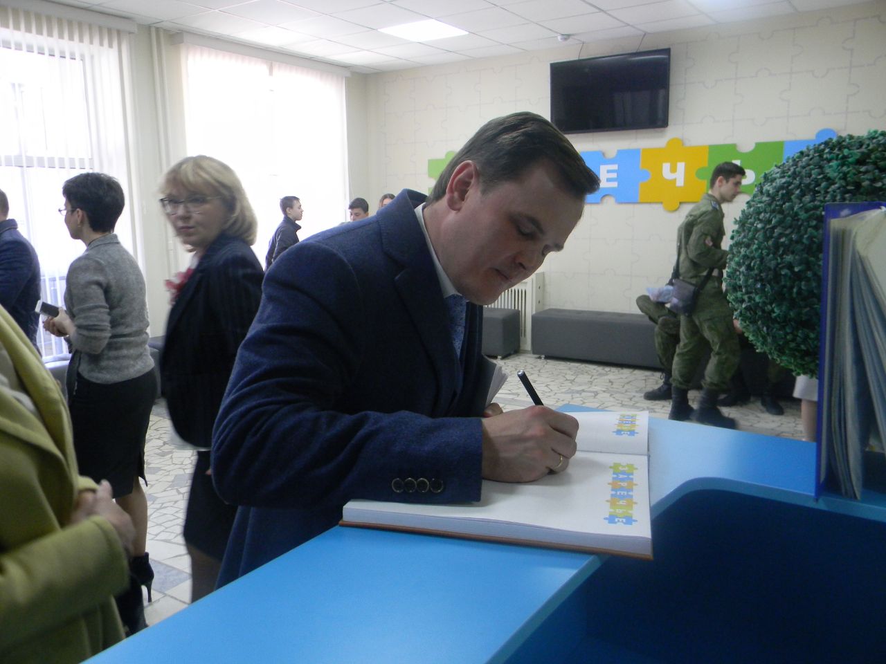 Памятная запись в книге почётных гостей ; Гости в зале Атлетической гимнастики ; Гости в актовом зале ; Гости в студии звукозаписи ;