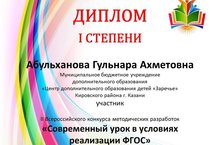 Педагог по вокалу Абульханова Гульнара Ахметовна приняла участие в III Всероссийском конкурсе методических разработок «Современный урок в условиях реализации ФГОС» в номинации Открытый урок на тему: «Звукообразование в речевой позиции» и заняла 1 место. Поздравляем, желаем успехов!