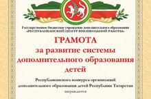 Наш Центр удостоился грамоты за развитие системы дополнительного образования детей в Республиканском конкурсе организаций дополнительного образования детей Республики Татарстан.