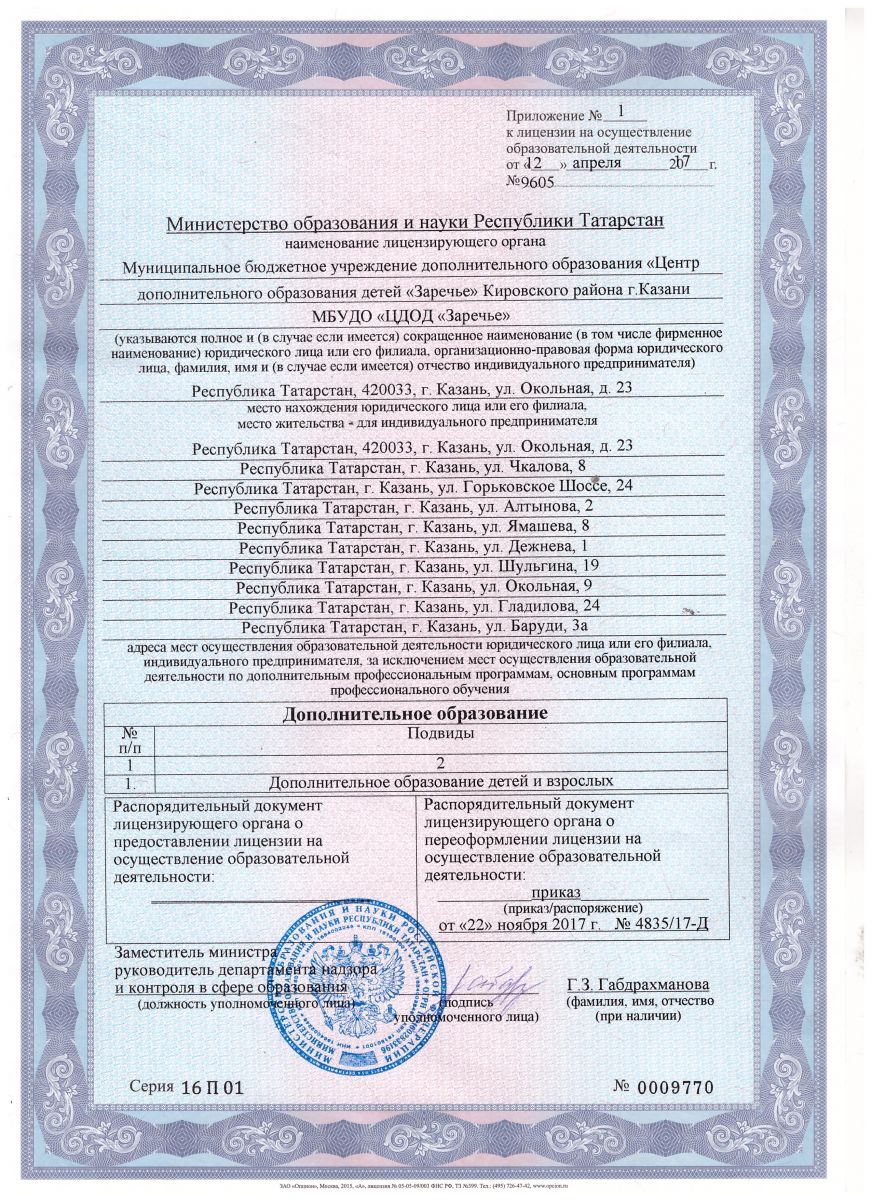 Приложение к лицензии на осуществление образовательной деятельности МБУДО «ЦДОД «Заречье»