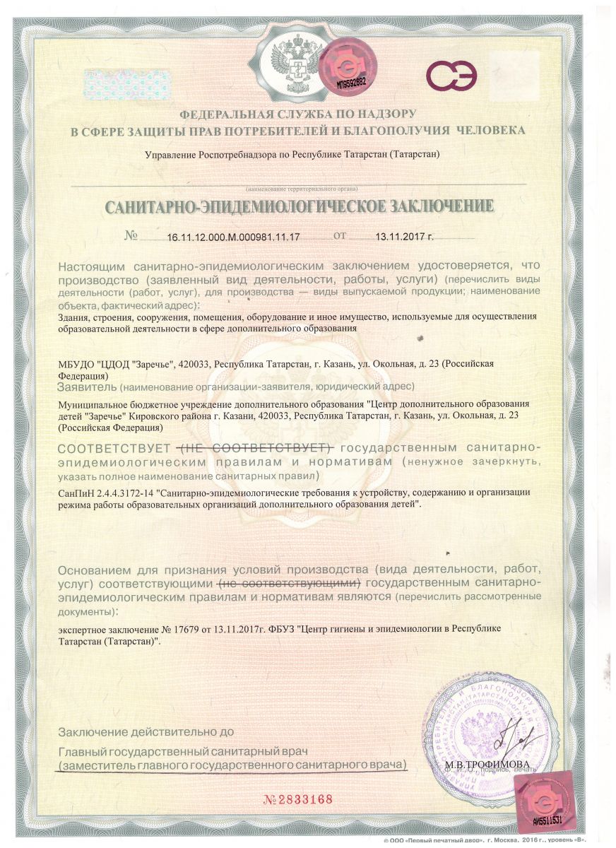 Лицензия на осуществление образовательной деятельности МБУДО «ЦДОД «Заречье»