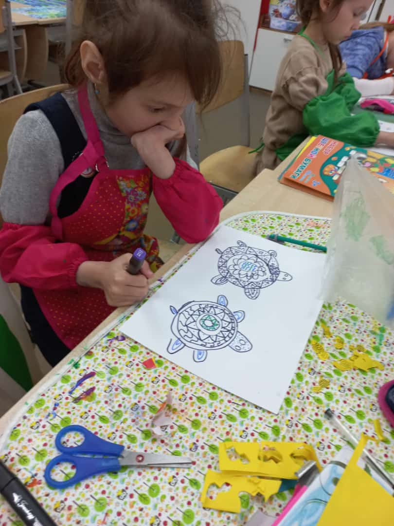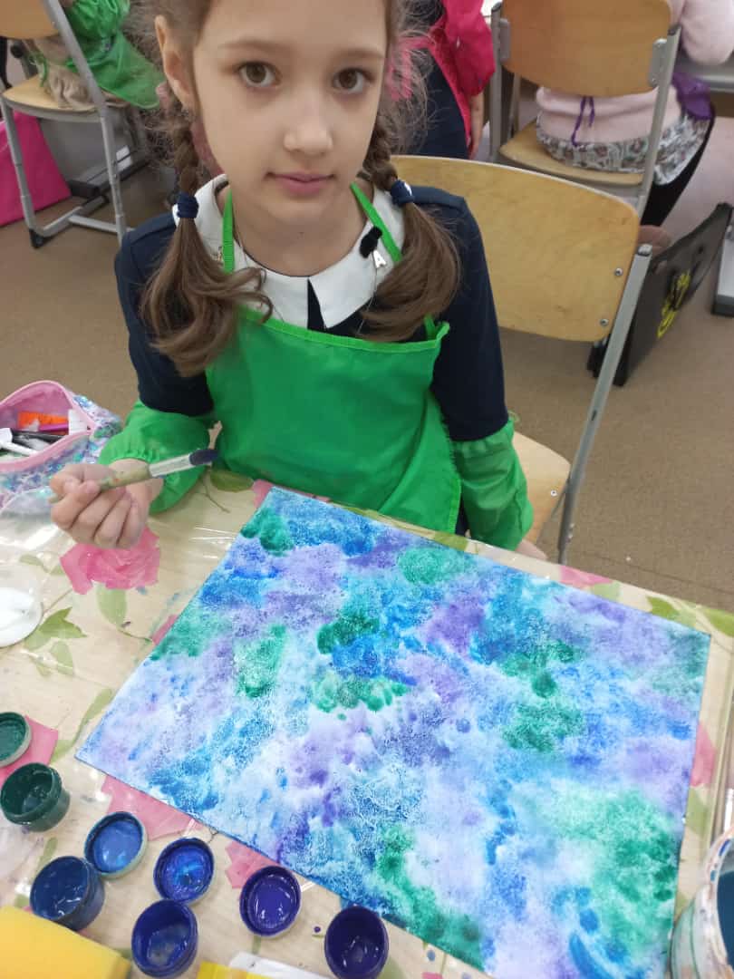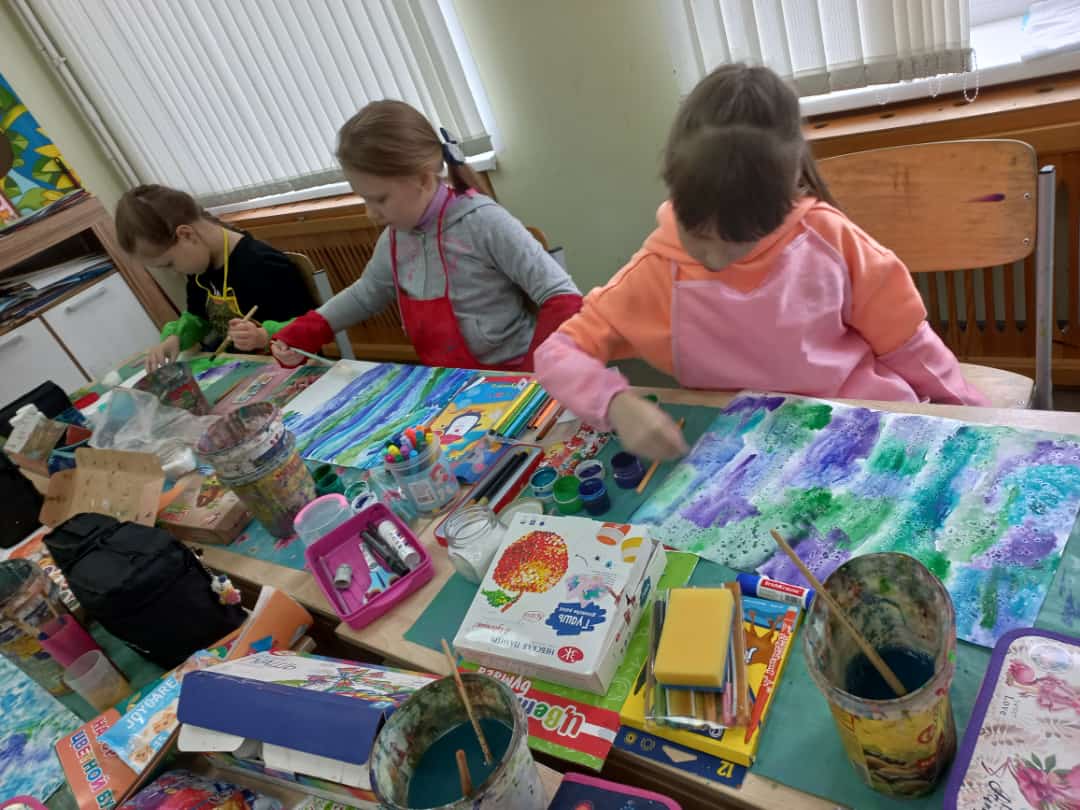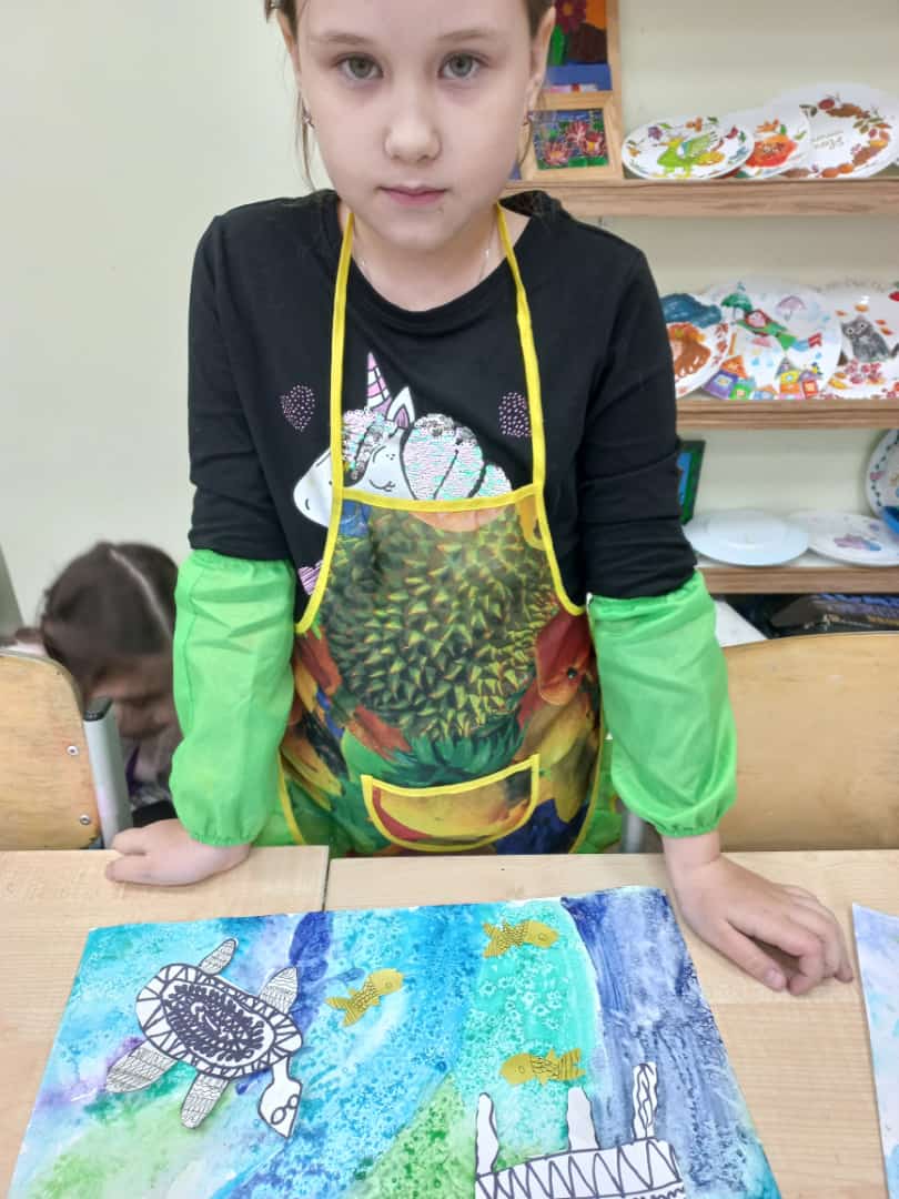 в технике «по-сырому» при помощи соли, рисовали морских обитателей в технике декоративной графики