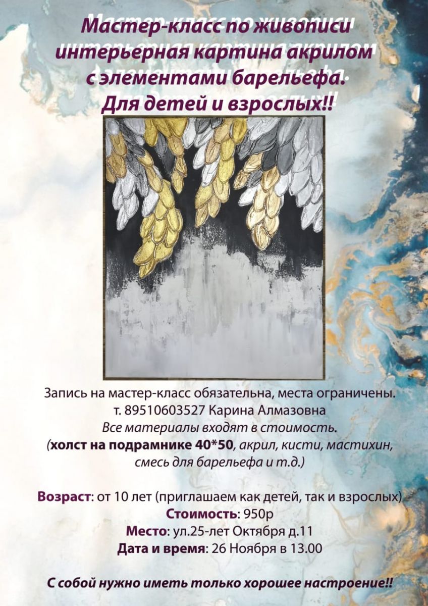 Опубликовано: 09.11.2022Приглашаем на мастер-класс по живописи "Интерьерная картина акрилом с элементами барельефа"