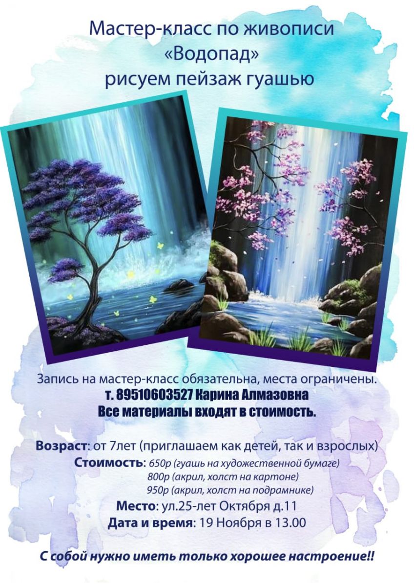 Опубликовано: 09.11.2022Приглашаем на мастер-класс по живописи "Водопад"