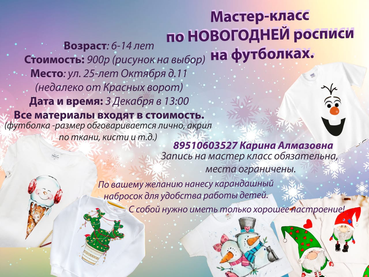 Опубликовано: 09.11.2022Приглашаем на новогодний мастер-класс по росписи на футболках