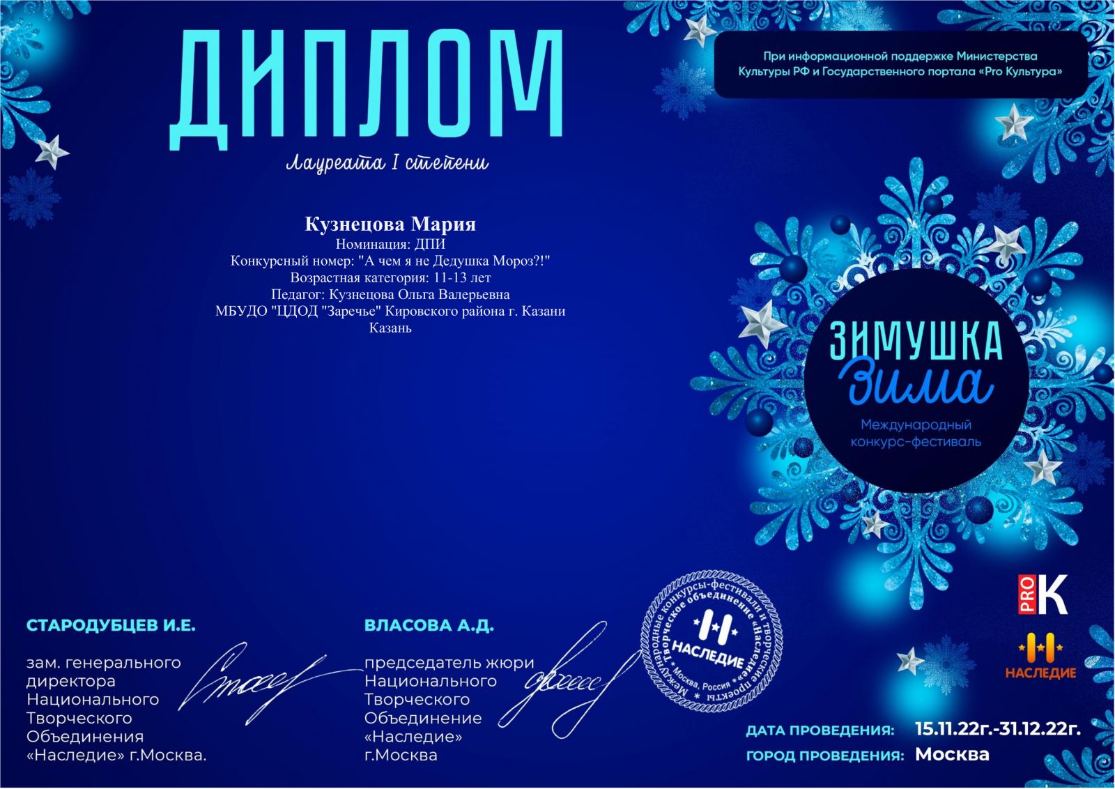 Победа в Международном конкурсе-фестивале «Зимушка-Зима»