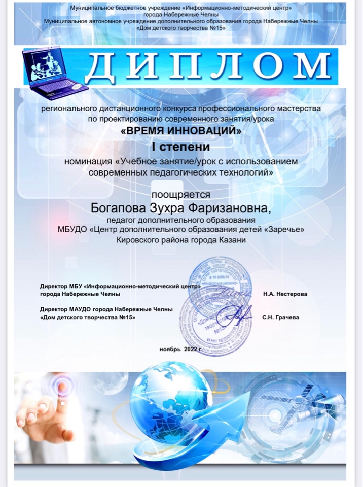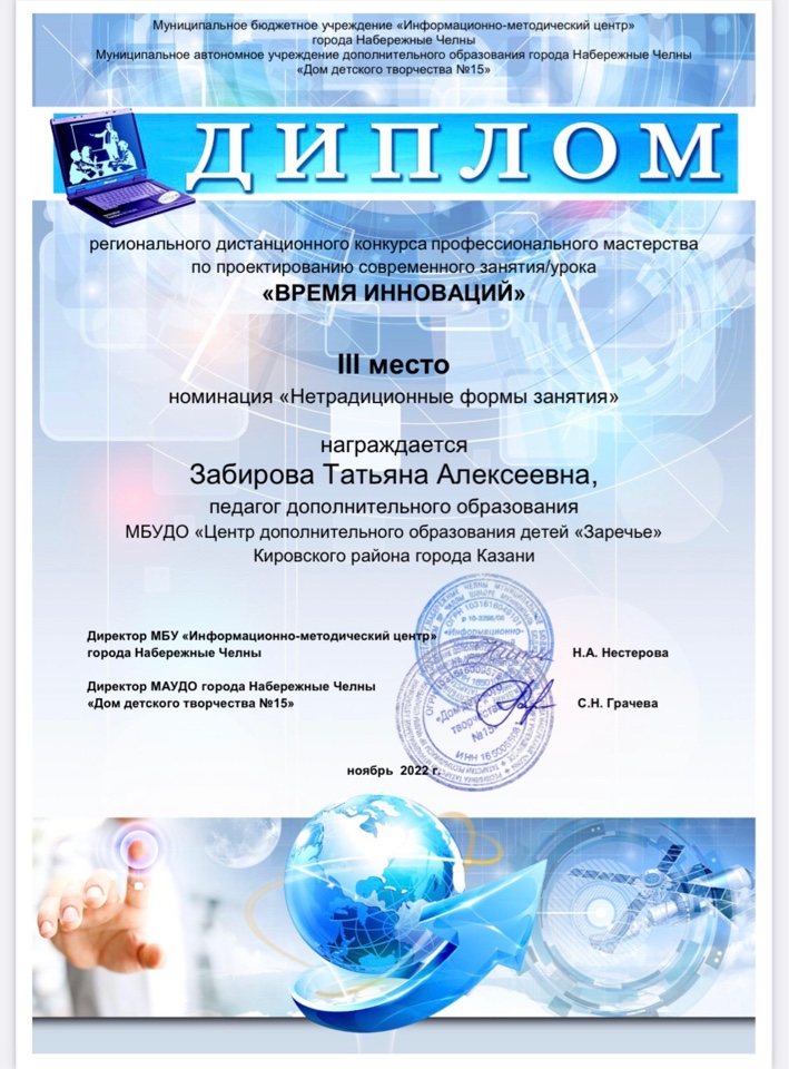 Сразу два педагога отдела технического и декоративно-прикладного творчества стали лауреатами Регионального конкурса профессионального мастерства «Время инноваций», проводимого Информационно-методическим центром города Набережные Челны.
