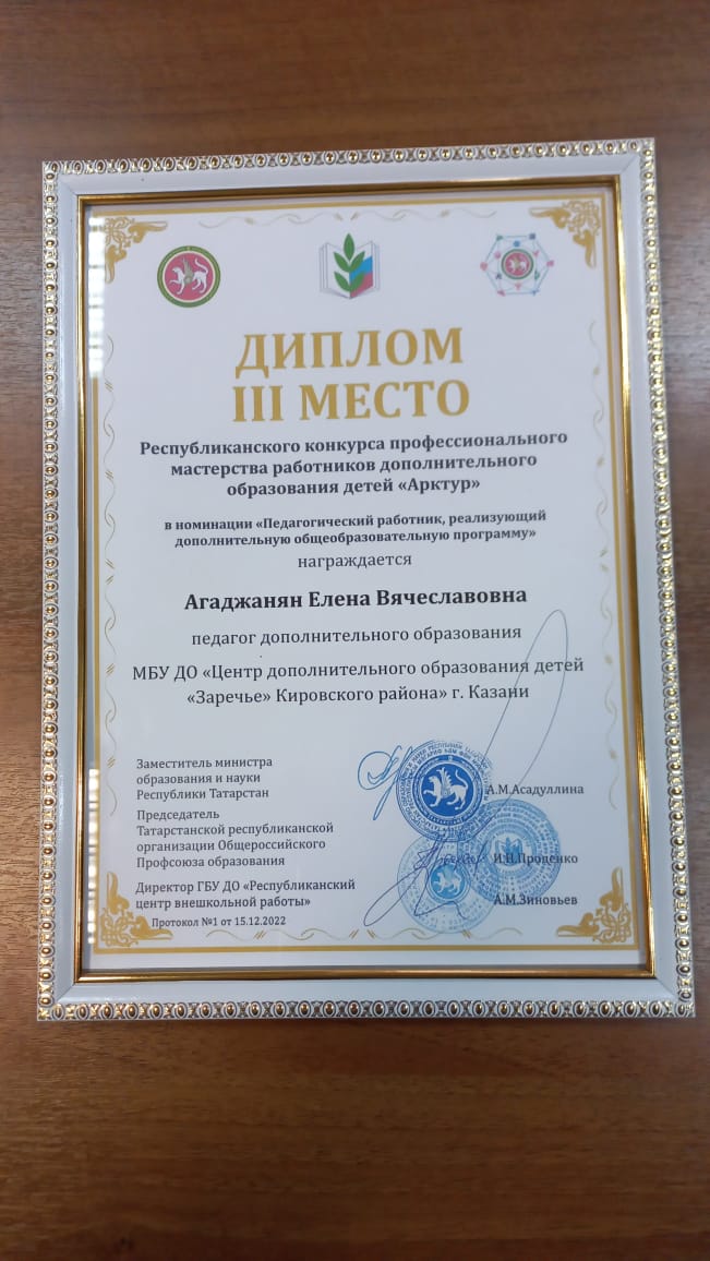 Опубликовано: 16.12.2022Поздравляем Агаджанян Елену Вячеславовну с победой на Республиканском конкурсе профессионального мастерства работников дополнительного образования детей "Арктур". Желаем дальнейших профессиональных и творческих побед!