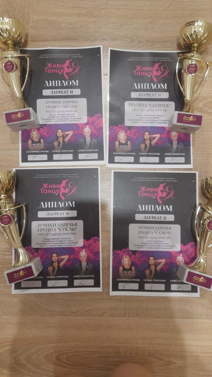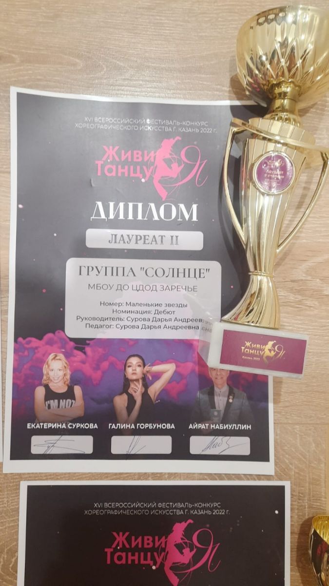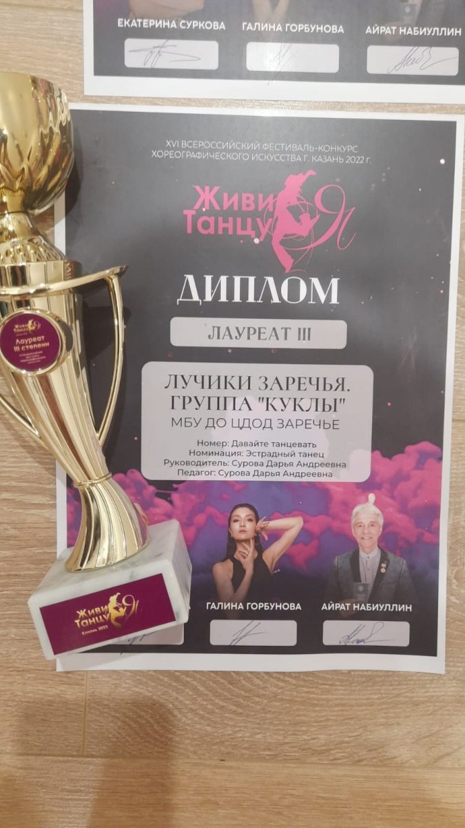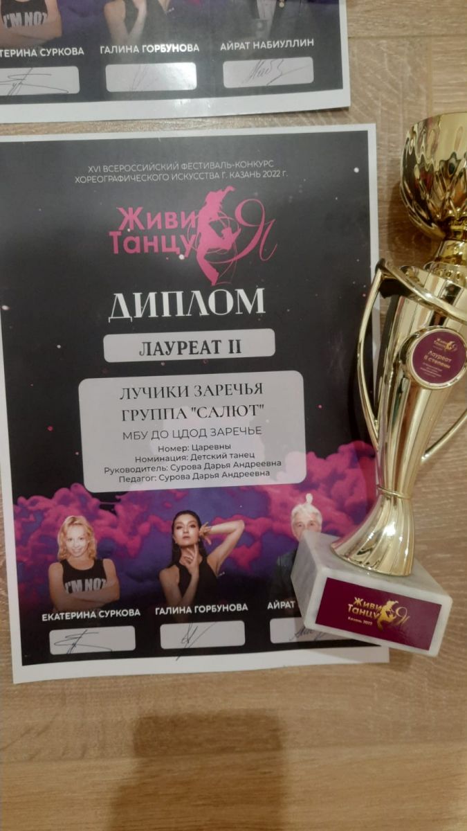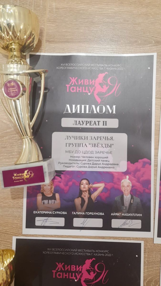 Опубликовано: 21.12.2022Поздравляем танцевальный коллектив "Лучики Заречья" (пдо Сурова Д.А.) с успешным выступлением на Всероссийском конкурсе "Живи танцуя". Дальнейших вам творческих успехов!