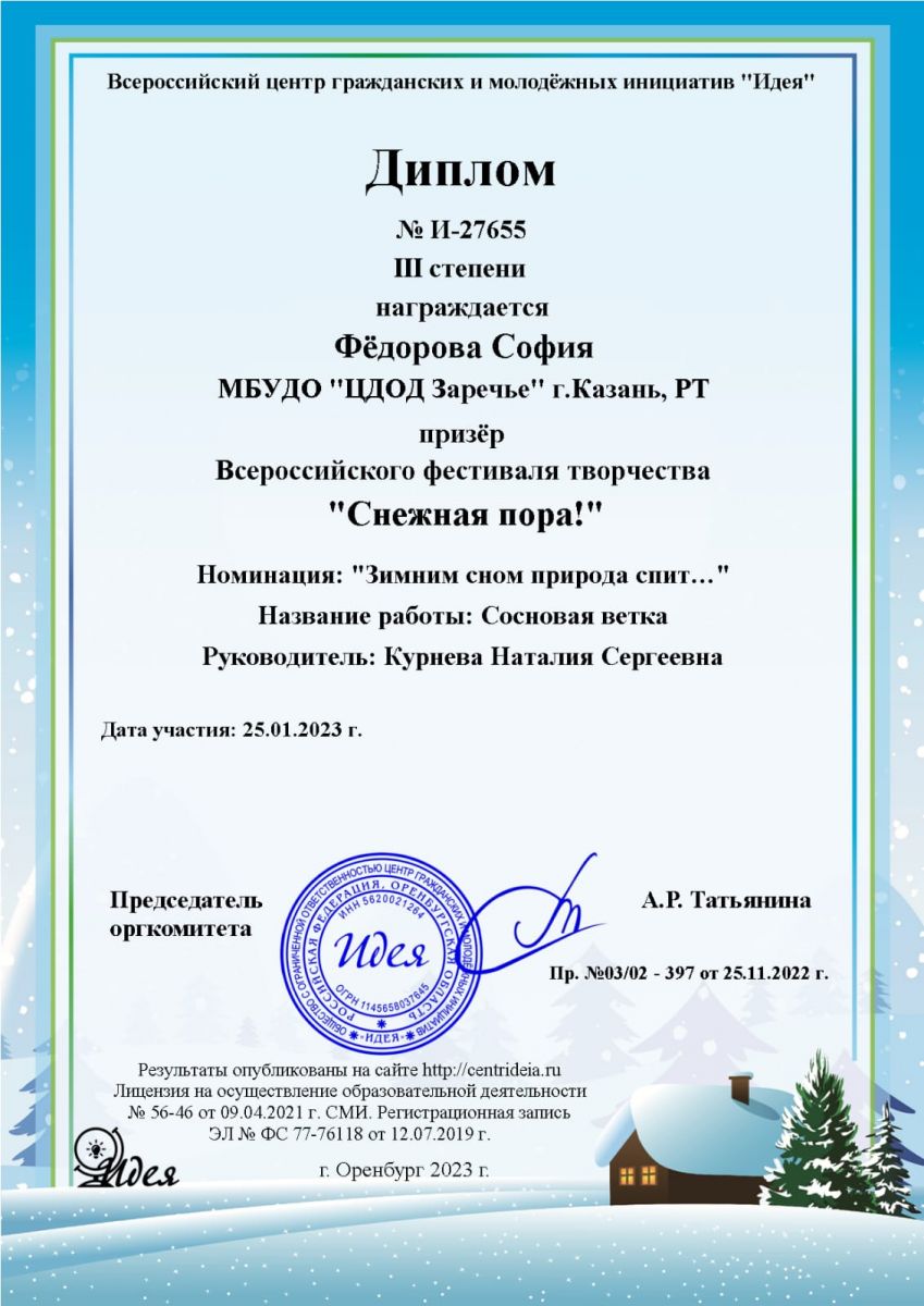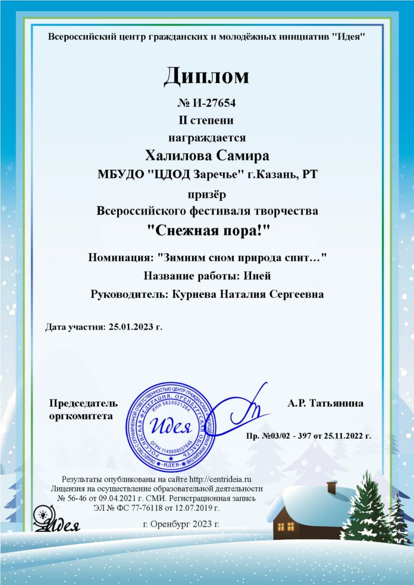 Опубликовано: 01.02.2023Учащиеся объединения "Юный фотограф" (педагог Курнева Н.С.) приняли участие во Всероссийском фестивале творчества "Снежная пора!" и получили призовые места. Желаем дальнейших успехов!