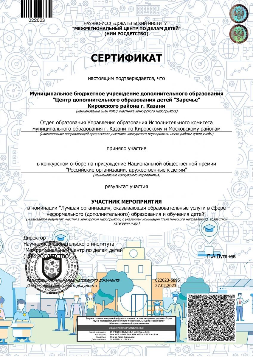 | Короткое название: | МБУДО "ЦДОД "Заречье" Кировского района г. Казани |