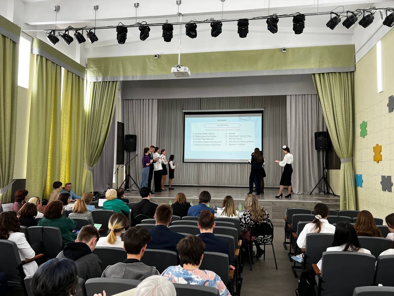 Лучшие учащиеся школ города Казани соревновались по результатам достижений за 3 года, представляли свою "Самопрезентацию", отвечали на вопросы в интеллектуальной игре "Quiz" и защищали проект на тему "Шпаргалка - благо или зло?"