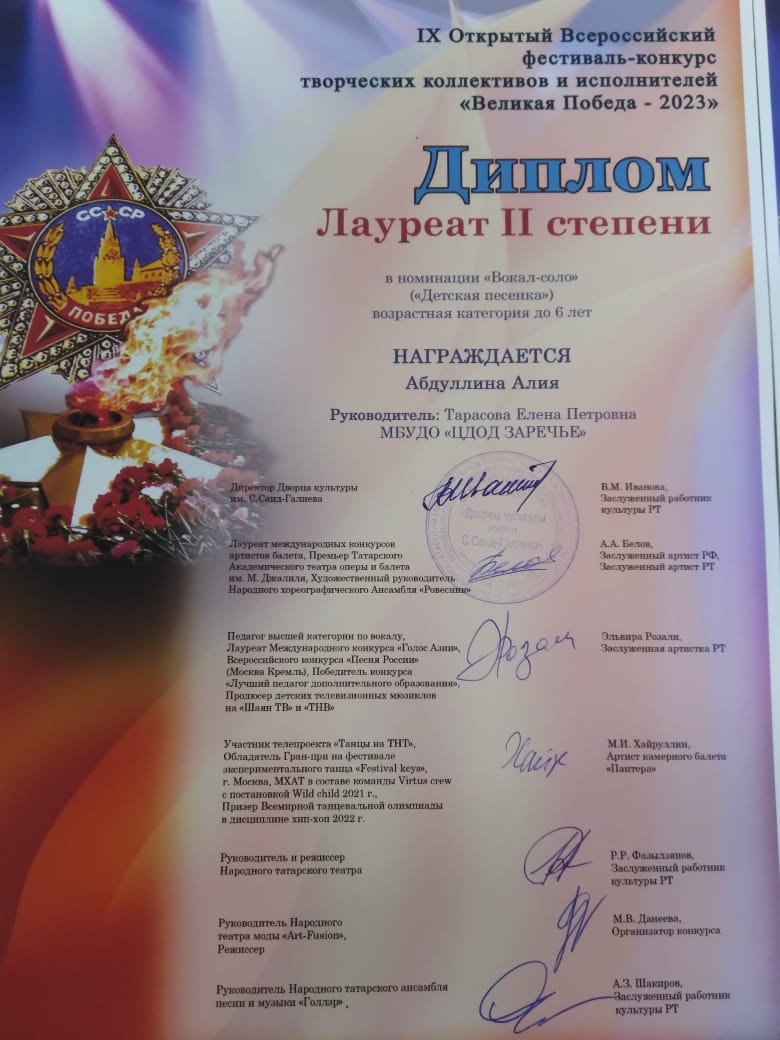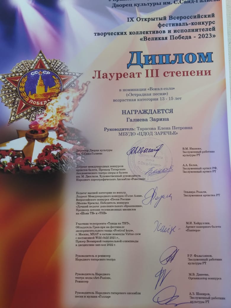 Опубликовано: 24.04.202322 апреля солисты вокального объединения "Исток" (педагог Тарасова Е.П.) приняли участие во Всероссийском фестивале-конкурсе "Великая Победа - 2023", который проходил в ДК им. С. Саид-Галиева.