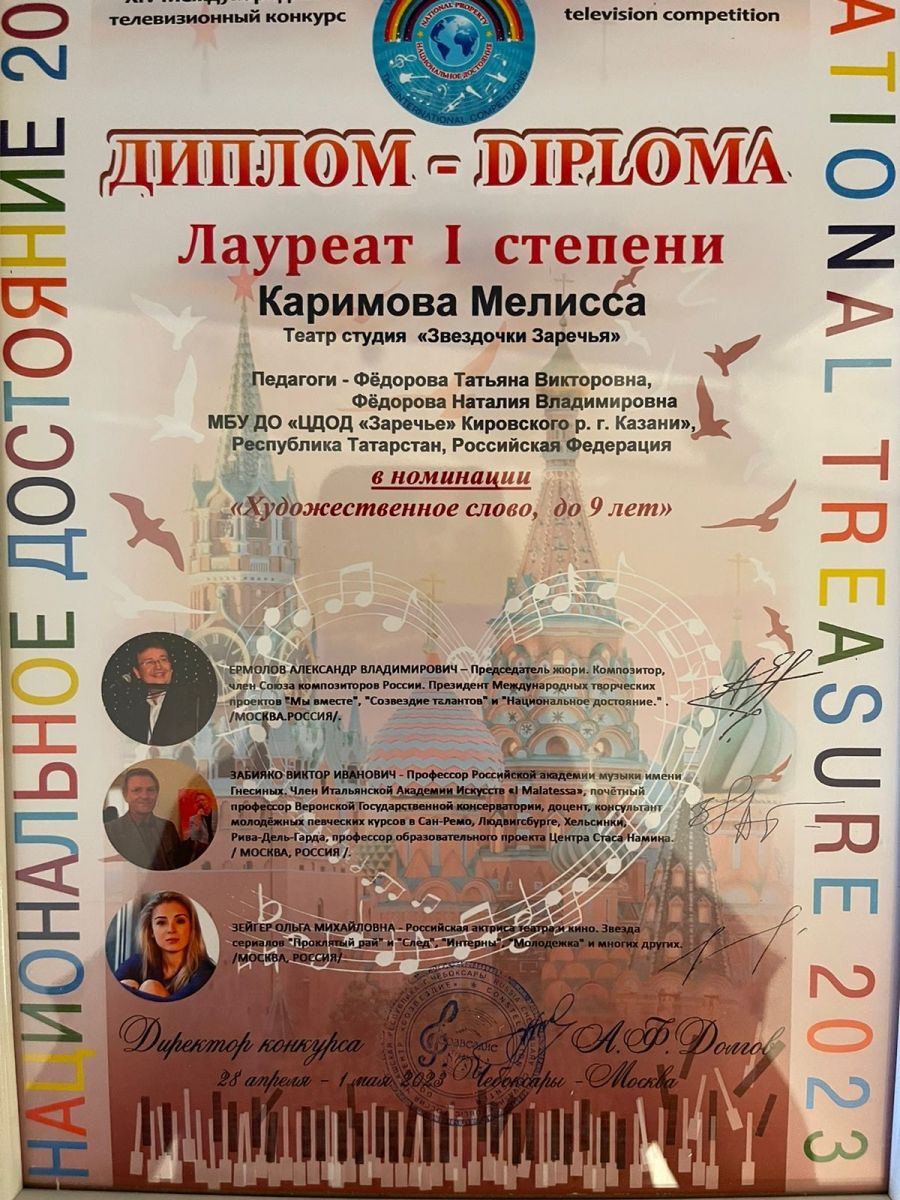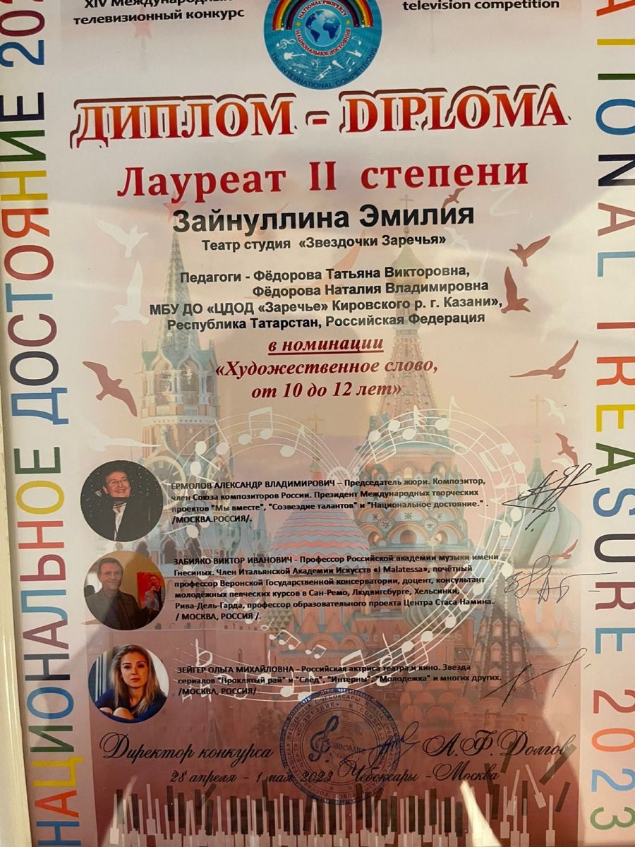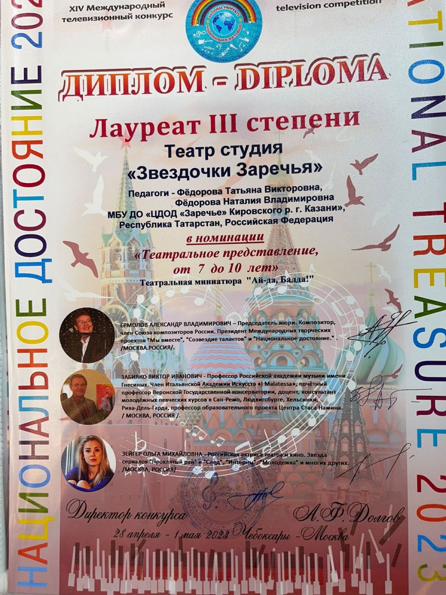 Опубликовано: 04.05.2023Обучающиеся театра студии «Звёздочки Заречья» под руководством педагогов дополнительного образования Фёдоровой Татьяны Викторовны и Фёдоровой Наталии Владимировны приняли участие в XIV Международном телевизионном конкурсе «Национальное достояние 2023» и стали дипломантами: