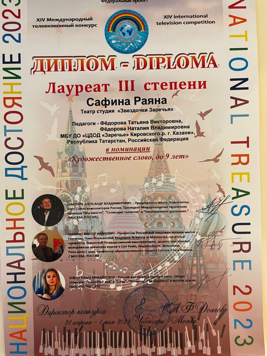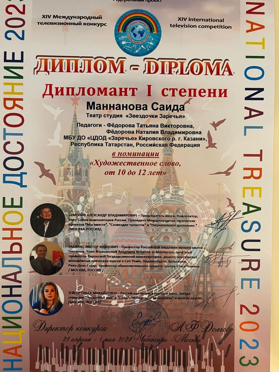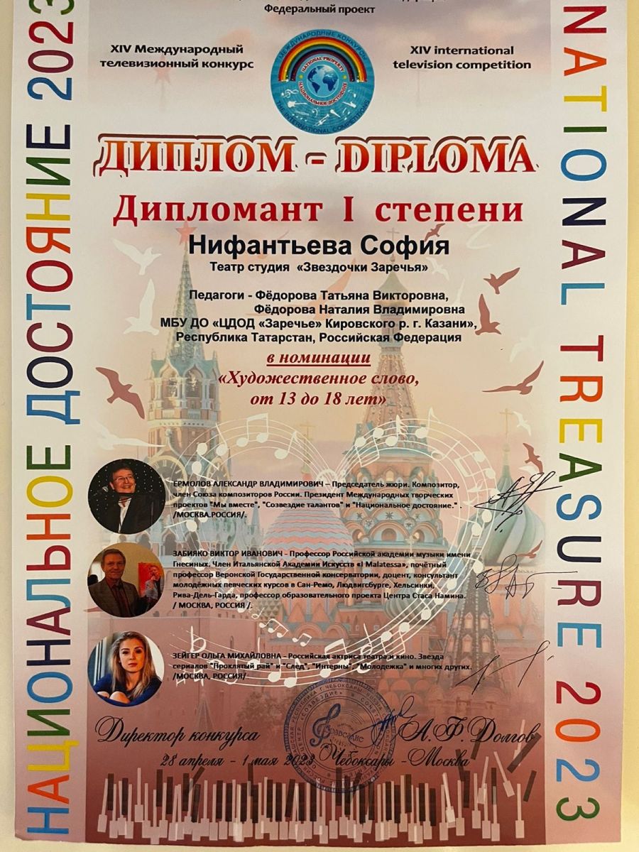 Опубликовано: 04.05.2023Обучающиеся театра студии «Звёздочки Заречья» под руководством педагогов дополнительного образования Фёдоровой Татьяны Викторовны и Фёдоровой Наталии Владимировны приняли участие в XIV Международном телевизионном конкурсе «Национальное достояние 2023» и стали дипломантами: