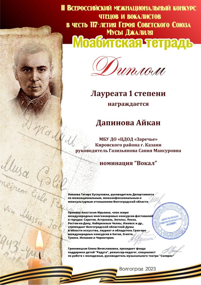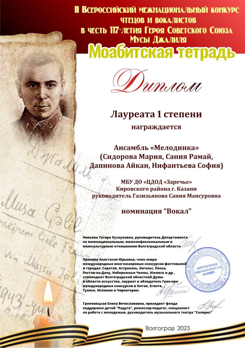 Опубликовано: 04.05.2023Обучающиеся объединения «Сольное и групповое пение» вокальной студии «ВОКАЛиЯ» под руководством педагога Газизьяновой Сании Мансуровны приняли участие во II Всероссийском межнациональном конкурсе чтецов и вокалистов «Моабитская тетрадь» в честь героя Совестского Союза Мусы Джалиля